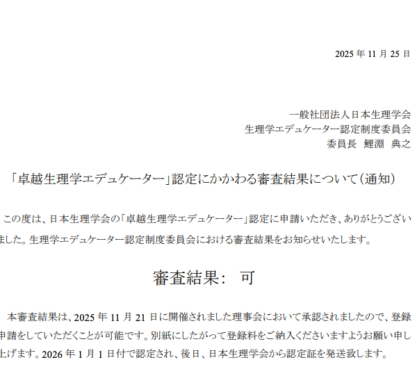 「卓越生理学エデュケーター」認定審査、承認されました