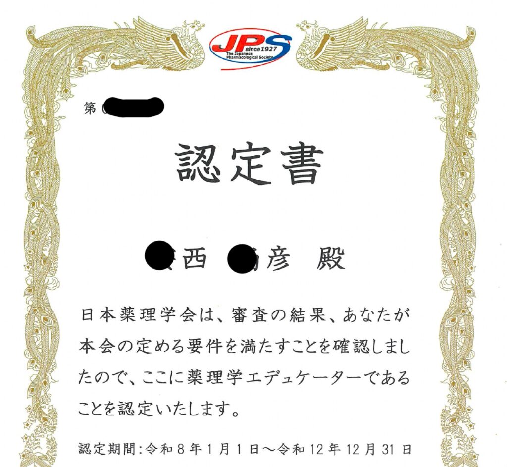 開封すると出てきたのは薬理学エデュケーターの「認定書」