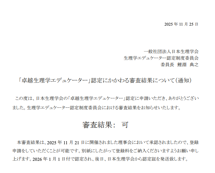 事前に申請をしておりました「生理学エデュケーター」認定登録更新にかかわる審査、及び「卓越生理学エデュケーター」認定にかかわる審査、ともに年 11 月 21 日に開催された日本生理学会理事会において承認されたとの連絡がありました。
