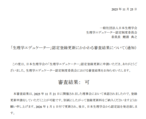 この結果、「生理学エデュケーター」登録更新料(10,000円)、及び「卓越生理学エデュケーター」登録料(10,000円)の納入により、来年2026年1月1日付で認定され、認定証を送って頂ける見込みとなりました。