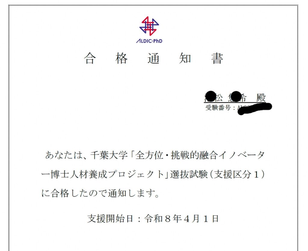 科学技術振興機構(JST)次世代研究者挑戦的研究プログラム(SPRING)により支援されている「(千葉大学)ALDIC-PhD 全方位・挑戦的融合イノベーター博士人材養成プロジェクト」の選抜試験に、当教室院生が合格しました!