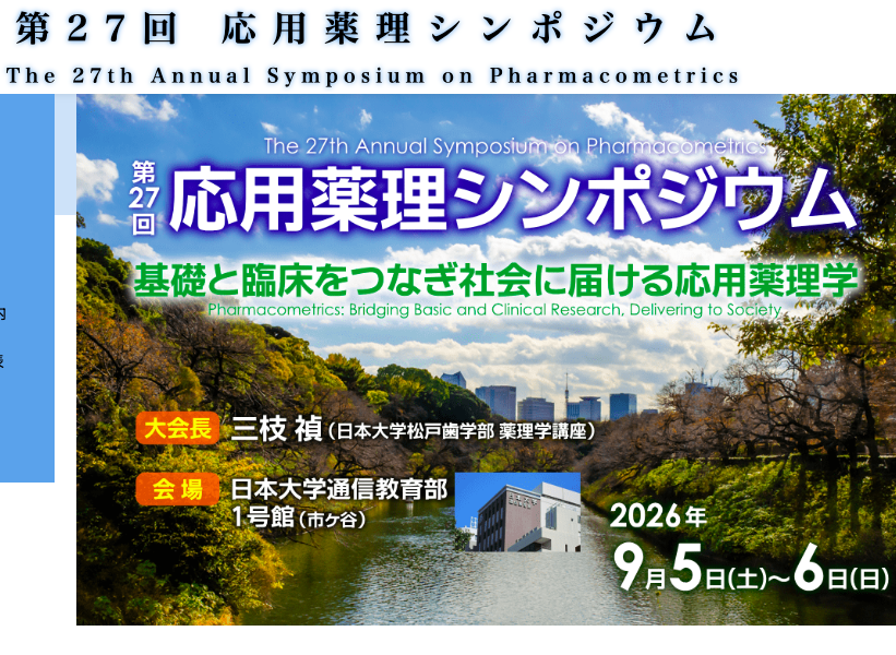 からはや5年、2026年9月5日(土)〜6日(日)に都内市ヶ谷の日本大学通信教育部1号館にて、第27回応用薬理シンポジウムが日大松戸市学部教授の三枝禎先生を対会長として開催されます。ホームページはこちら